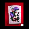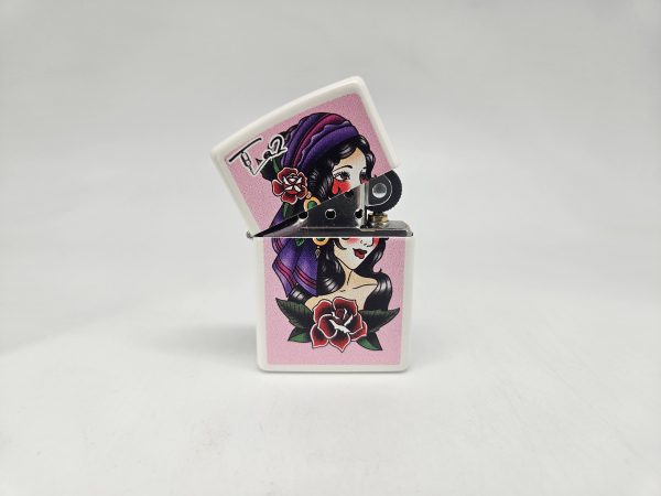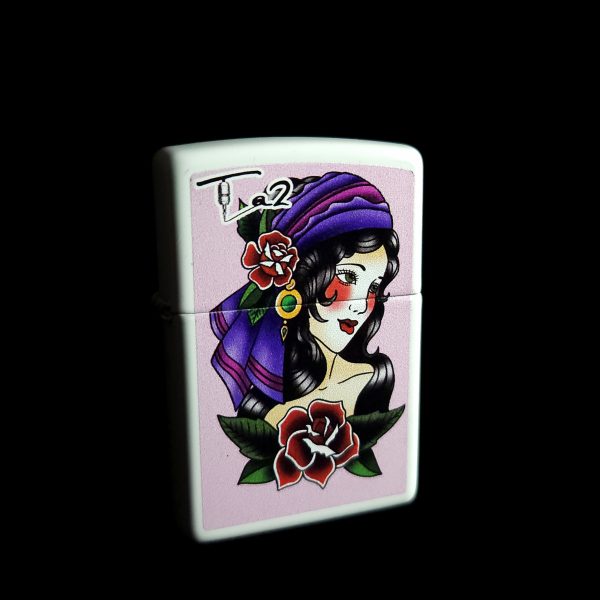 White Zippo lighter with Ta2 pink background and woman wearing purple head band on front of zippo.
