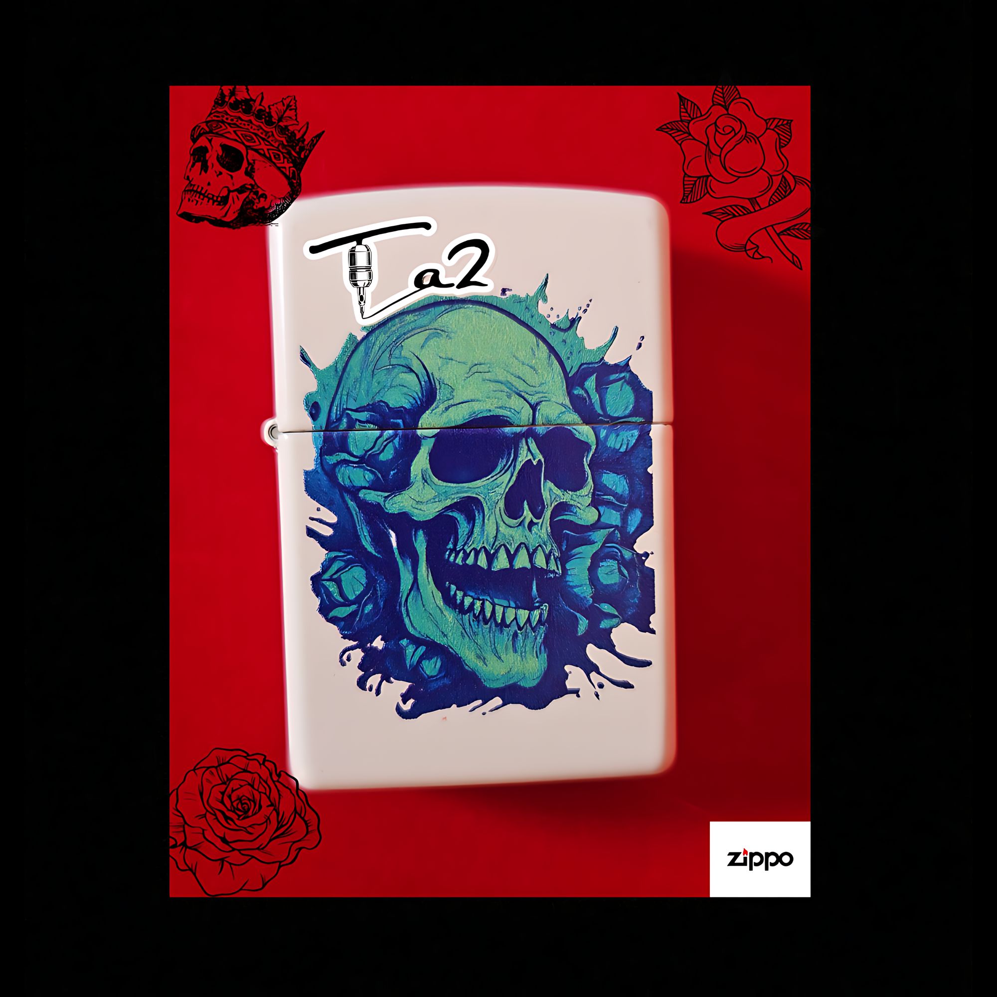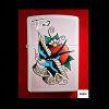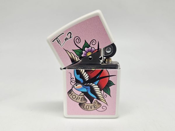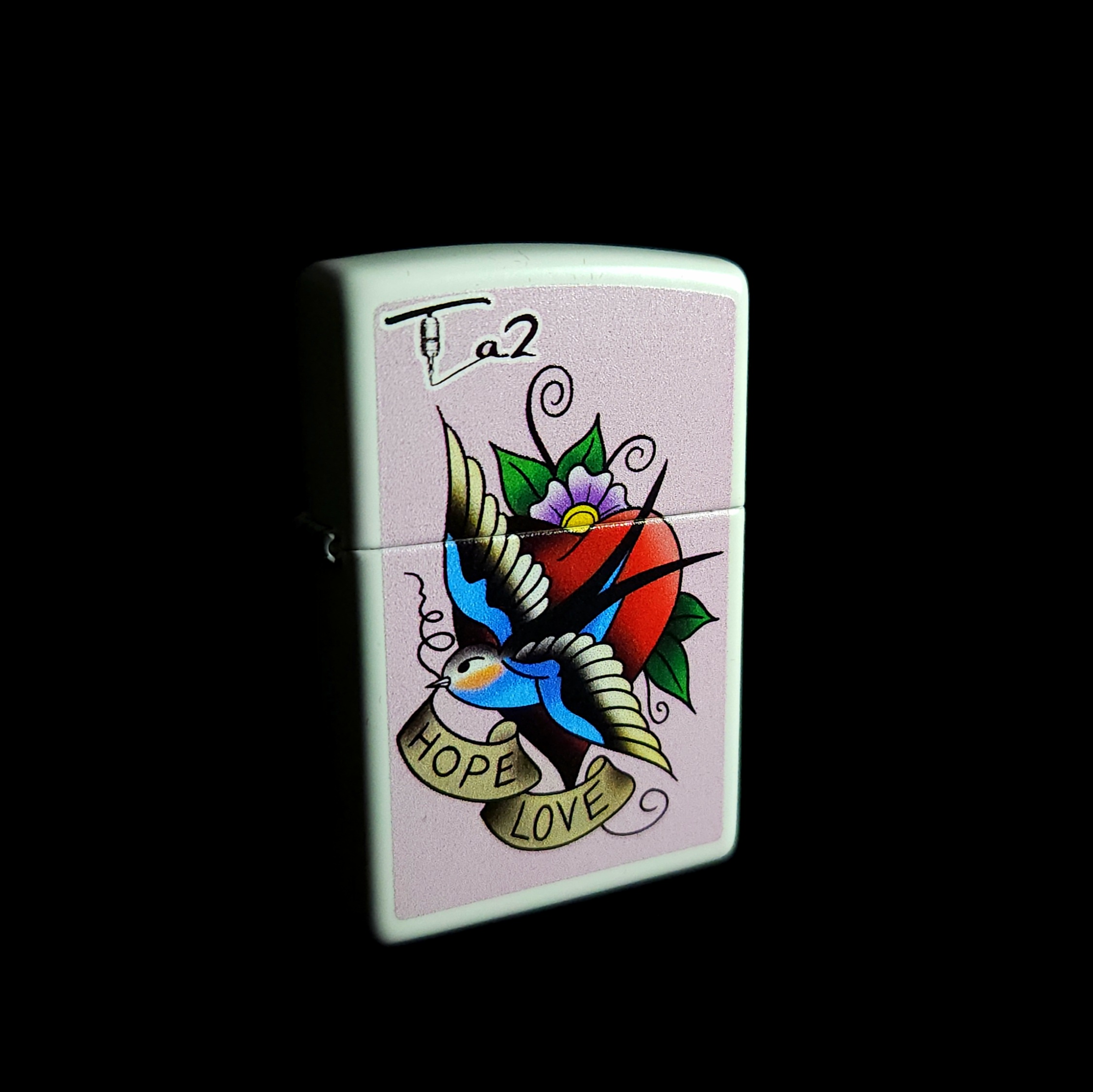 White Zippo lighter with Ta2 pink background, swallow, heart and words printed on front of zippo. Zippo logo on bottom of lighter This Lighter is a limited series and will be concluded after the 100th Zippo