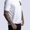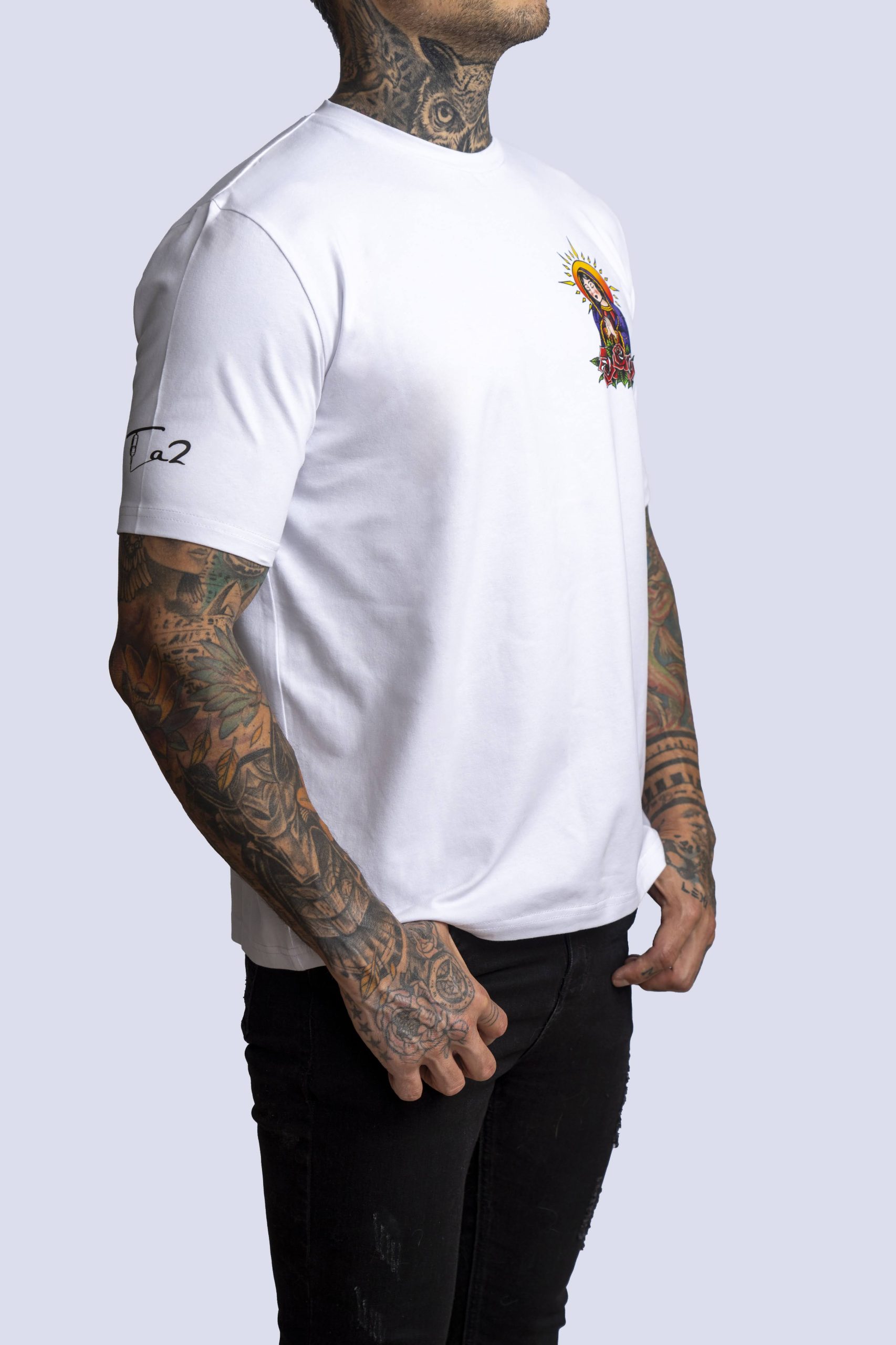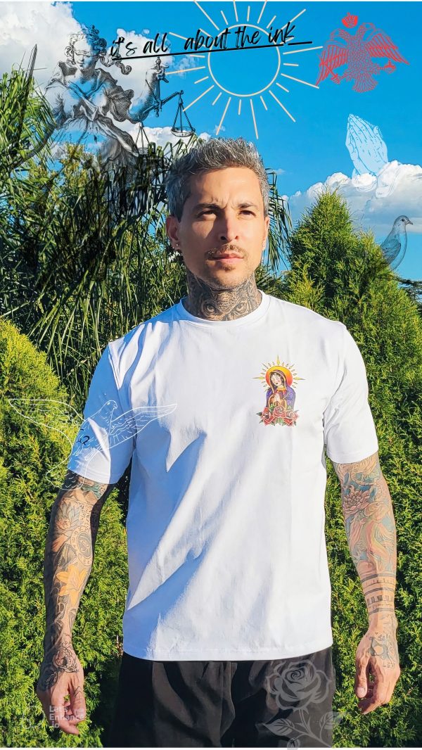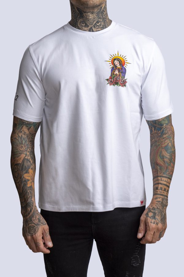 White cotton t-shirt with Ta2 saint praying design on pocket region.