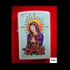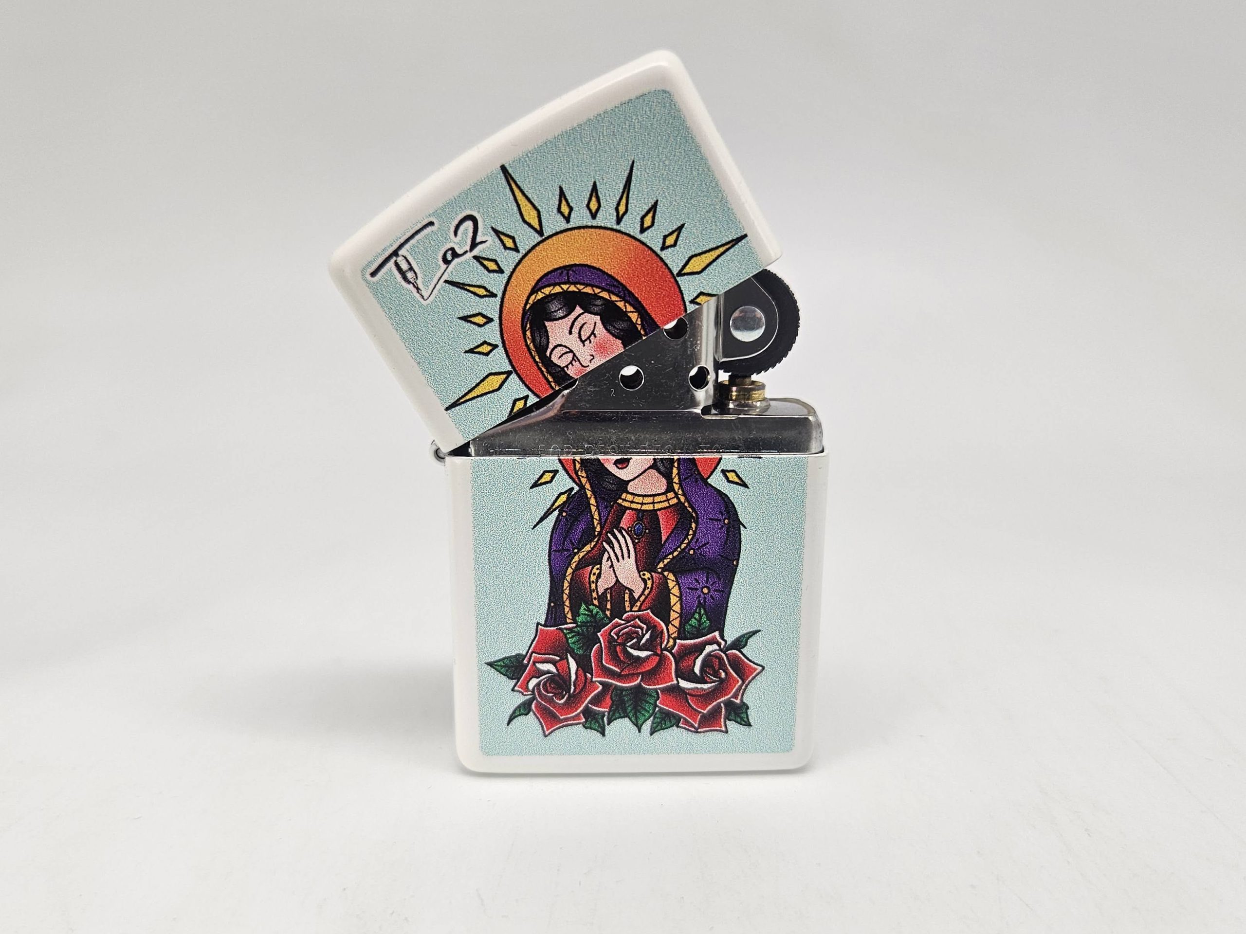 White Zippo lighter with Ta2 green background and Saint praying on front of zippo.