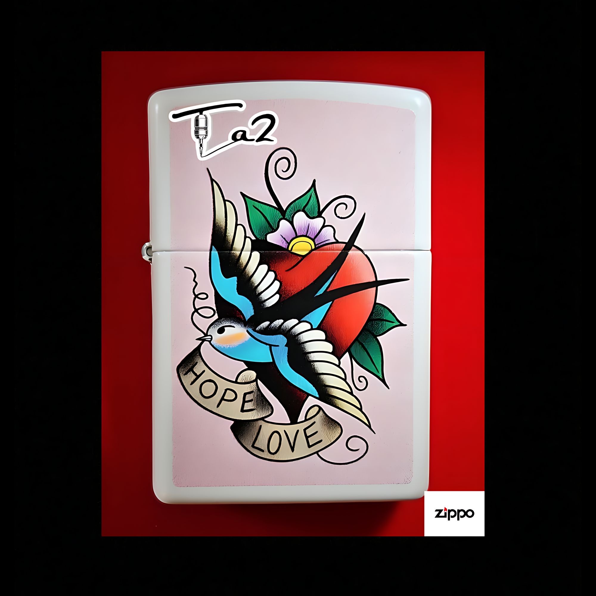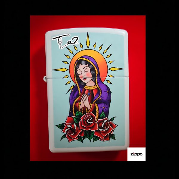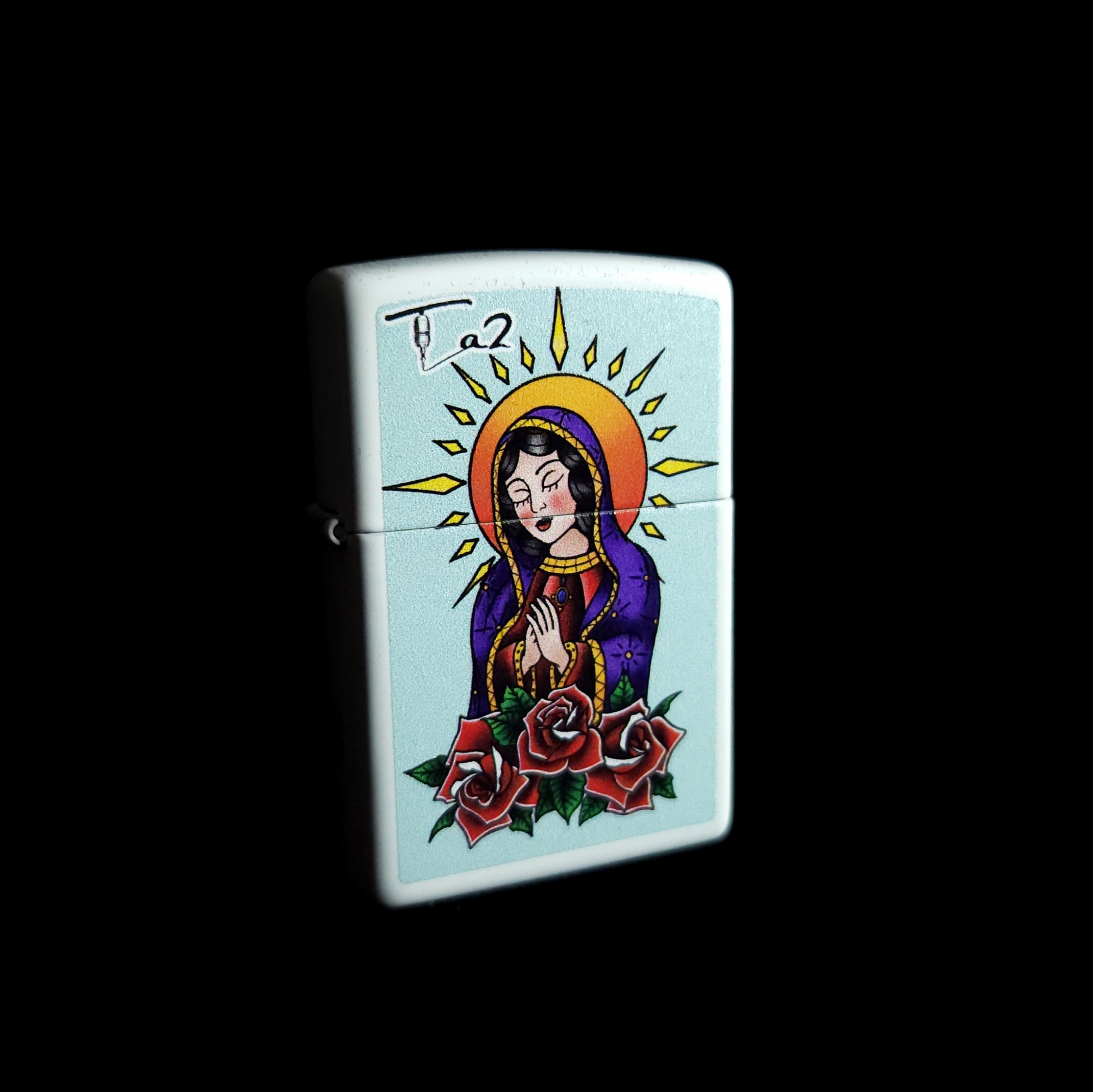 White Zippo lighter with Ta2 green background and Saint praying on front of zippo. Zippo logo on bottom of lighter This Lighter is a limited series and will be concluded after the 100th Zippo