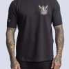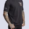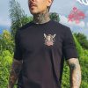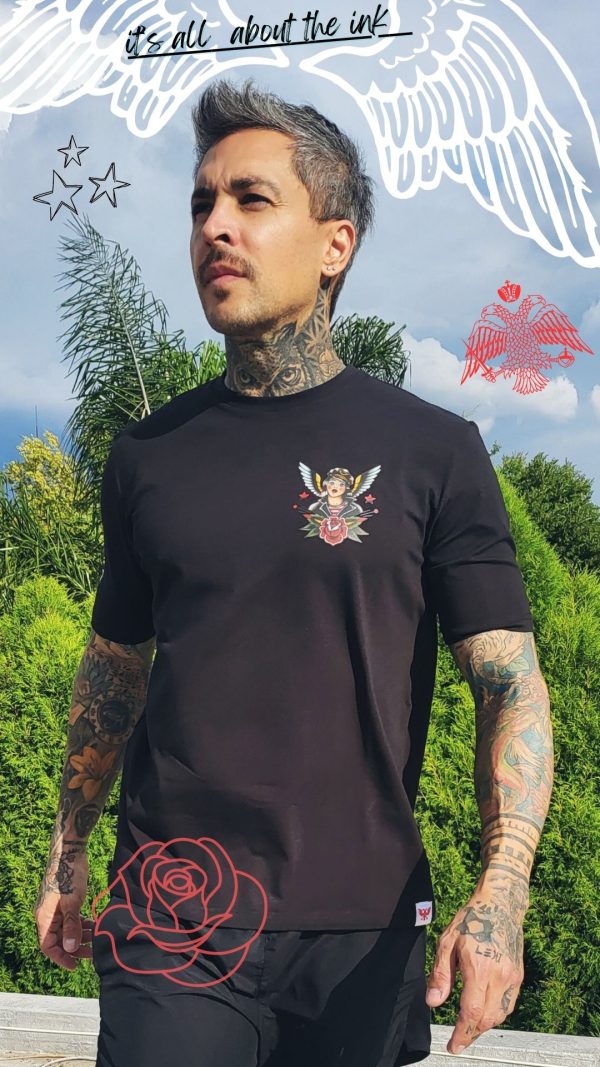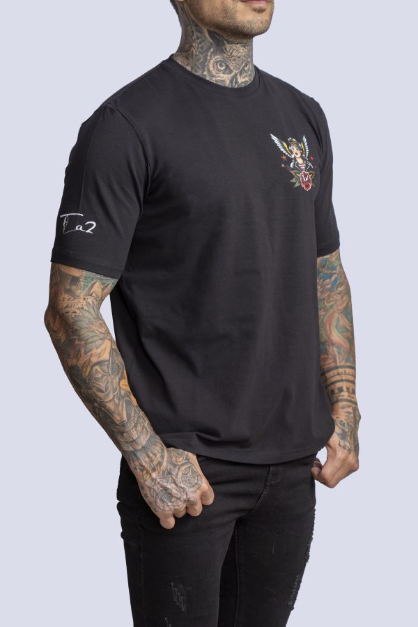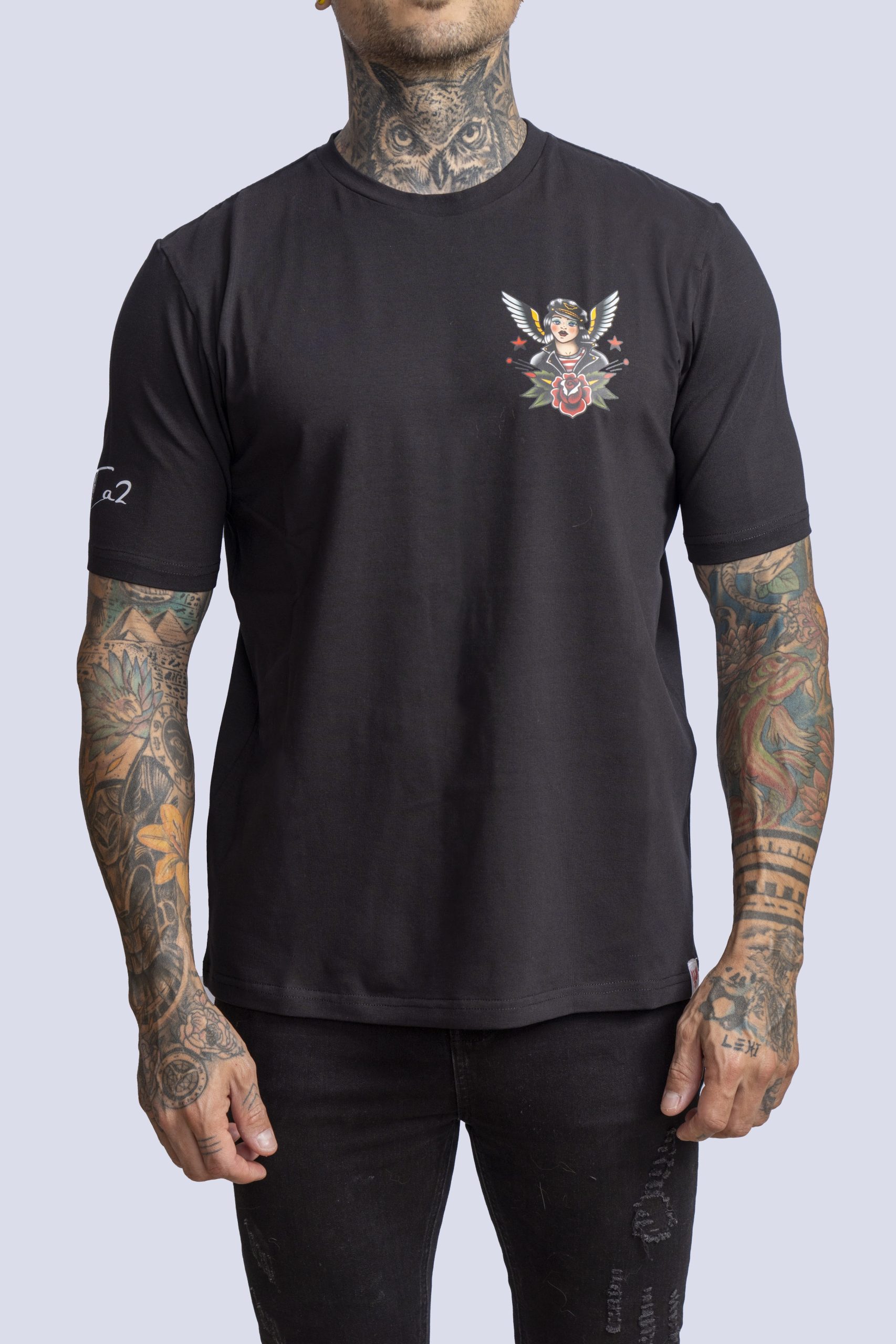 White cotton t-shirt with Ta2 woman in black leather jacket and wings design on pocket region